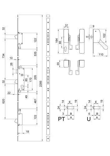 Maniglione antipanico da infilare dotato di tre catenacci basculanti. Il meccanismo è a doppio funzionamento per facilitare il posizionamento ambidestro ed è predisposto per il montaggio del comando esterno. Il frontale è disponibile nella versione piatta o con forma a U. Disponibile in tre versioni di entrata: 25, 30 e 35 mm. Solo per porte ad un’anta.