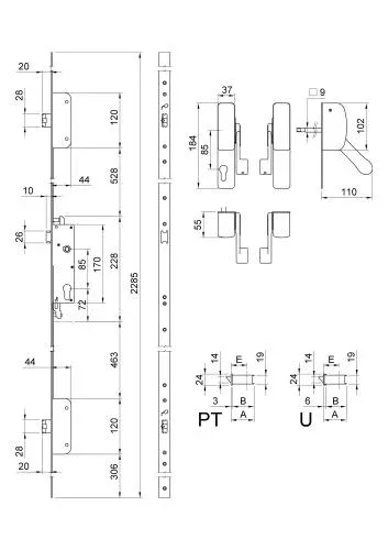 Maniglione antipanico da infilare dotato di tre punti di chiusura, due dei quali a riarmo automatico. Il meccanismo è a doppio funzionamento per facilitare il posizionamento ambidestro ed è predisposto per il montaggio del comando esterno (solo cilindro). Il frontale è disponibile nella versione piatta o con forma a U. Disponibile in due versioni di entrata: 30 e 35 mm. Solo per porte ad un’anta.