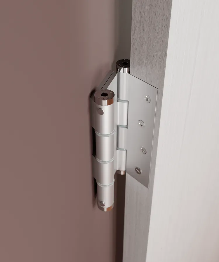 Cerniera per porte a vento per installazione diretta a parete o cornice della porta, richiede solo la fresatura della porta senza controtelaio. Riduce fino al 50% il tempo di assemblaggio rispetto a quello di una cerniera a vento convenzionale. Progettato per porte larghe con spessore compreso tra 25 e 35 mm.