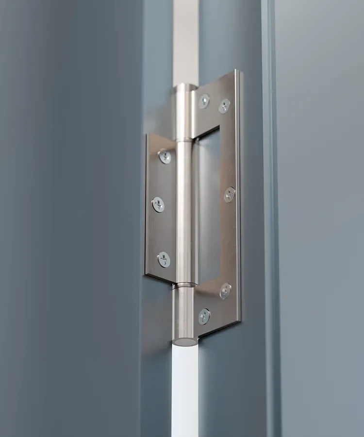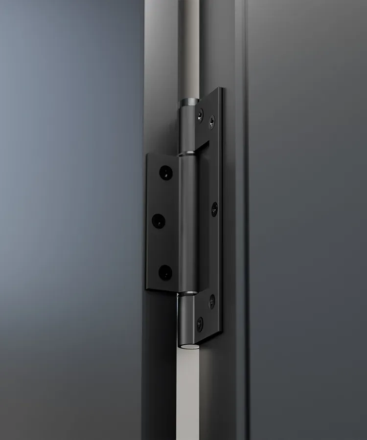 Cerniere in alluminio o in inox con un disegno particolare dove una bandella lavora dentro l’altra, offrendo uno spessore totale eccezionalmente ridotto (2,5mm) che permette, in molti casi, di evitare l’incasso.