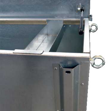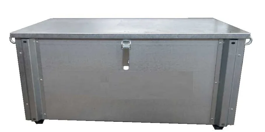 Bauli in lamiera zincata, piedini e golfari per il sollevamento, pistoni per apertura del coperchio