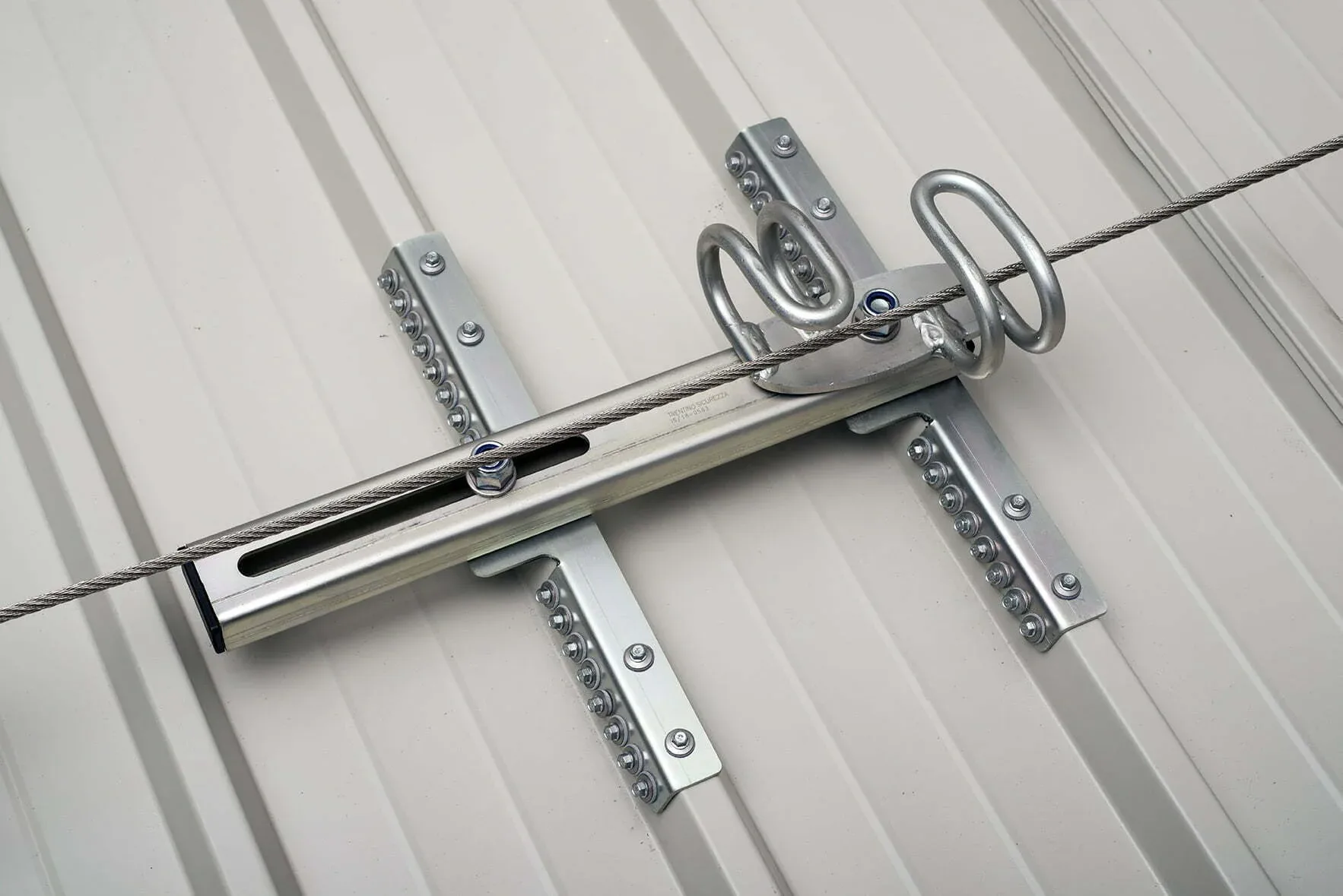 Linea vita orizzontale con ancoraggi per lamiera grecata. Compatibile con interasse greche da 200 a 400 mm.